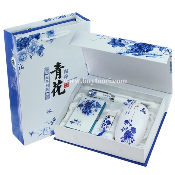 青花瓷笔(签字笔或钢笔):纯陶瓷烧制的笔。青花瓷签字笔,禀承“古文化,现代品”开发理念,将华夏五千年的历史文明融入时尚的现代生活,以现代的视觉理念全新阐释中国元素,每款产品均由视觉大师设计,采用青花瓷为主料, 传统手工苛制,创意独到、匠心独具,集实用、艺术、欣赏、收藏为一体,极致、奢华,尽显贵族气质! 青花瓷传统U盘(容量:2/4/8G):特别设计:抗震防潮,防电磁波 精品青花名片夹: 商品规格:9.5*5.8*0.7CM 材质:金属 特点:大开大阖间,回归简单,品味典雅